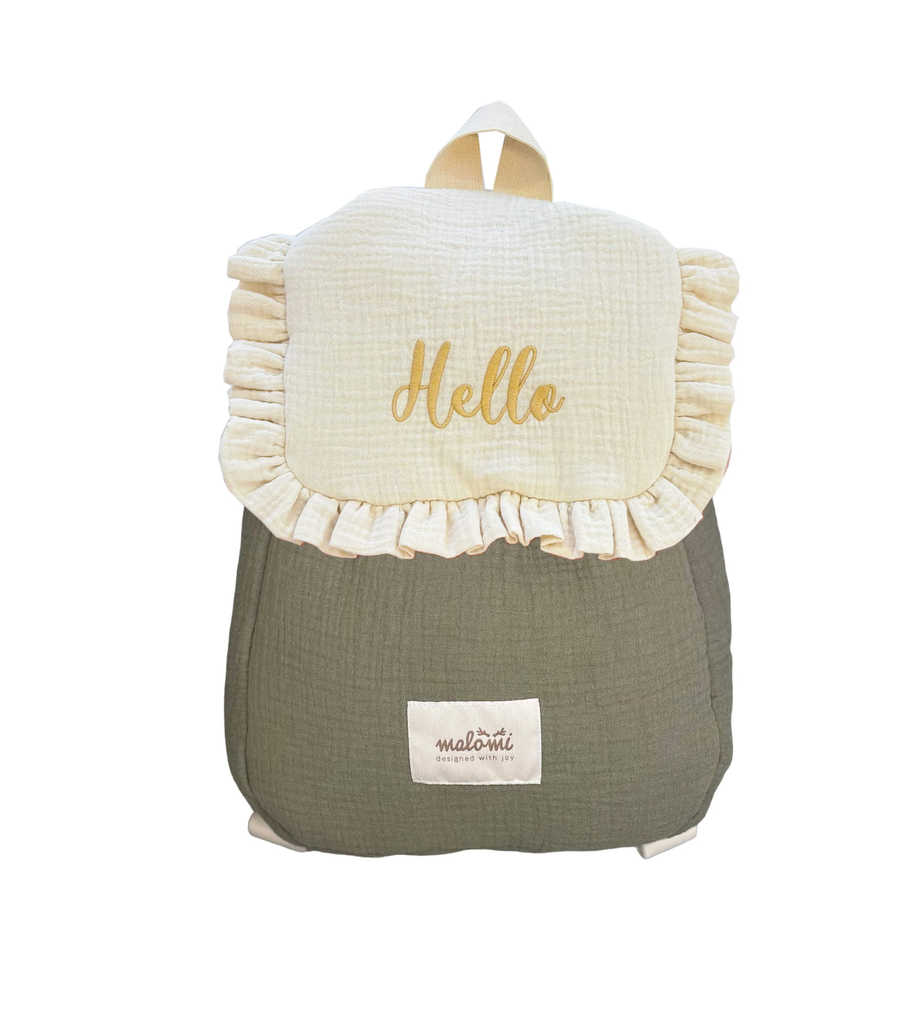 The backpack is made of delicate muslin. There is a thin filling between the outer and inner layer, which makes the whole thing extremely delicate and soft. Backpack in the form of a bag, under the flap it is pulled down with a convenient clip. Any text can be embroidered on the front flap. This makes the backpack even more unique. The straps of the backpack are adjustable, thanks to which it will fit both a 3-year-old and an adult.